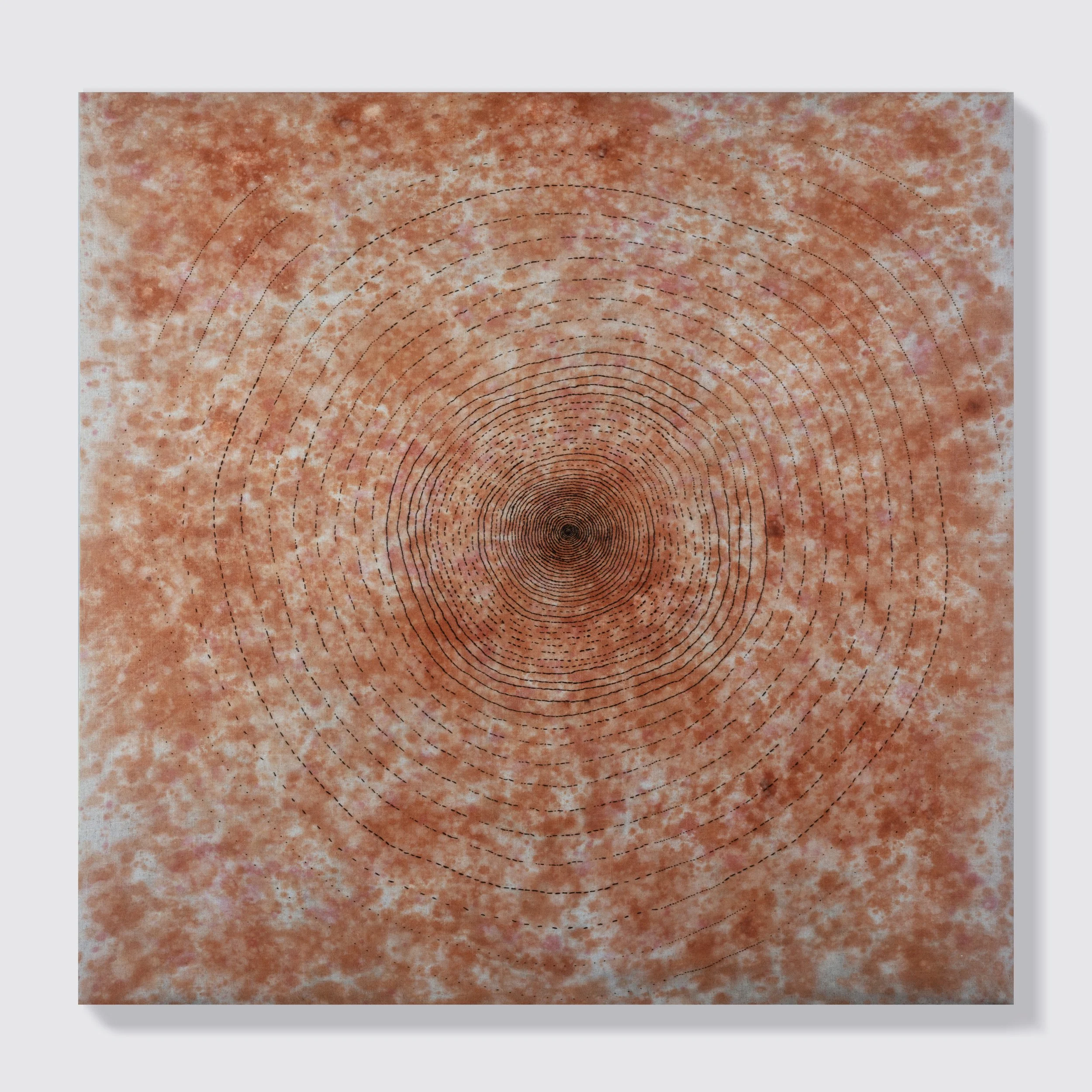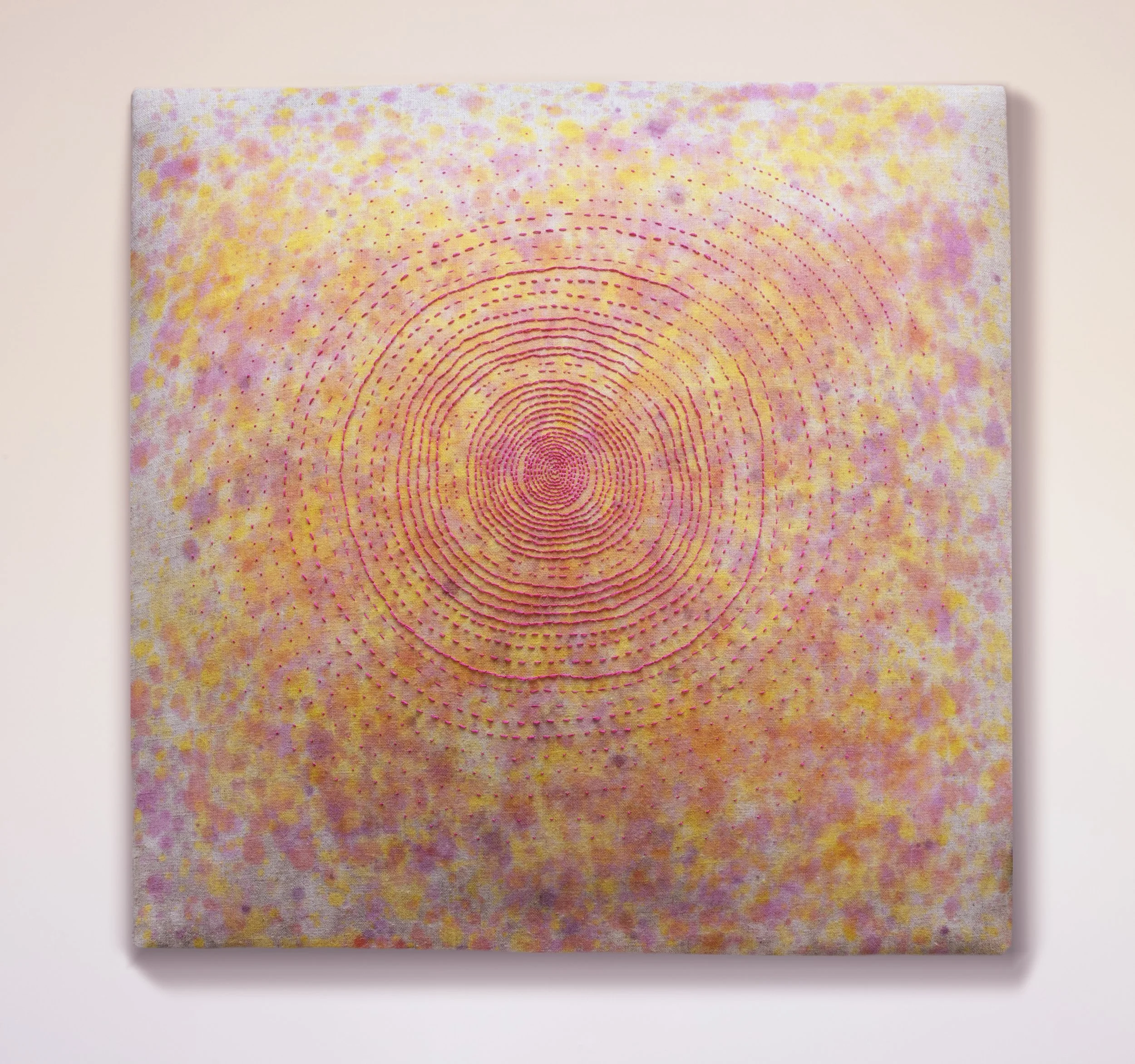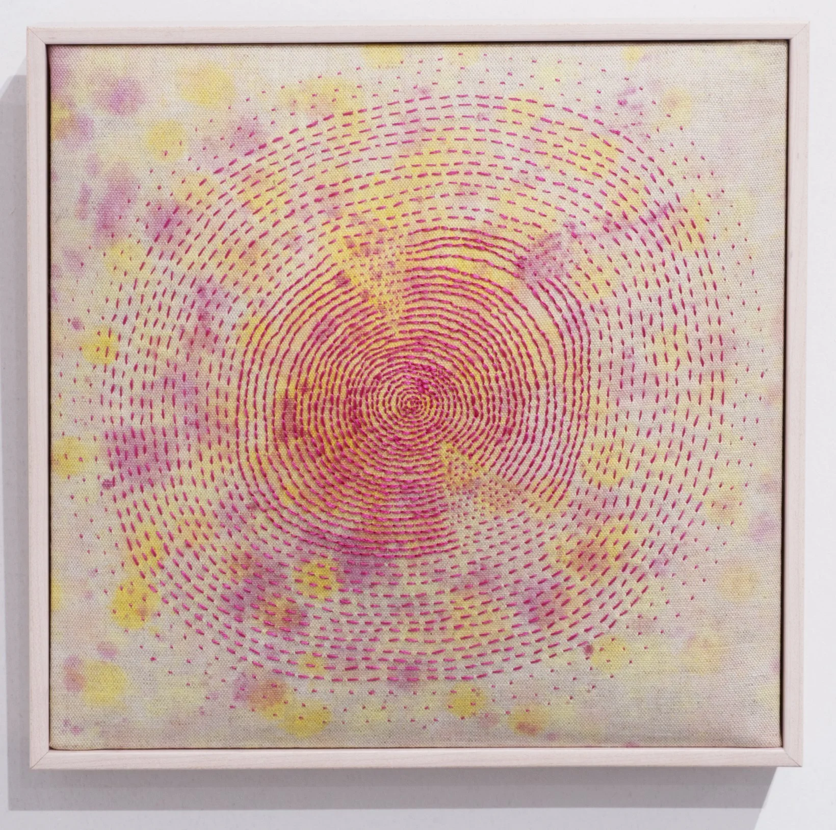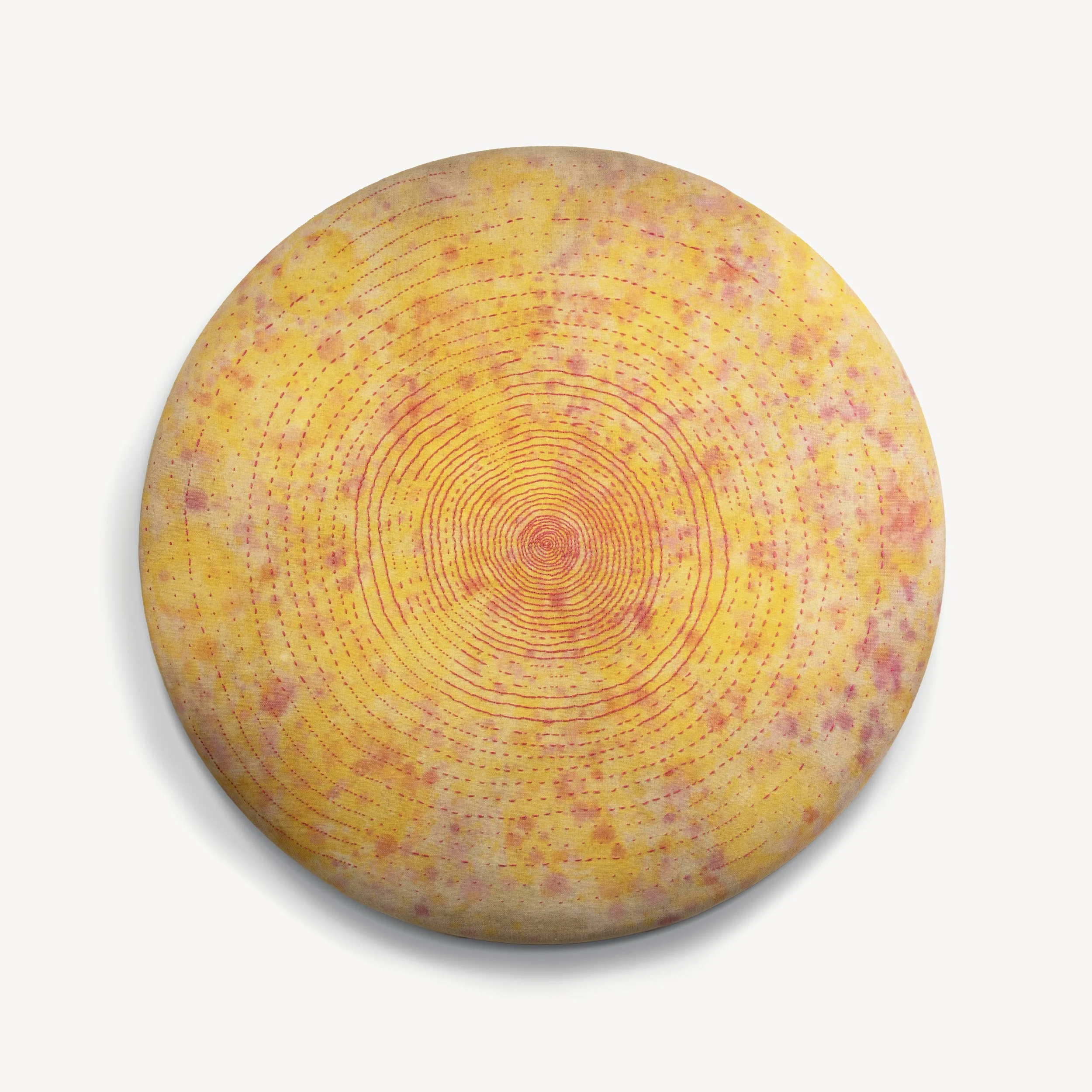 Hand embroidery on linen with futon stuffing on circular stretcher bars. 24” x 24” x 3”