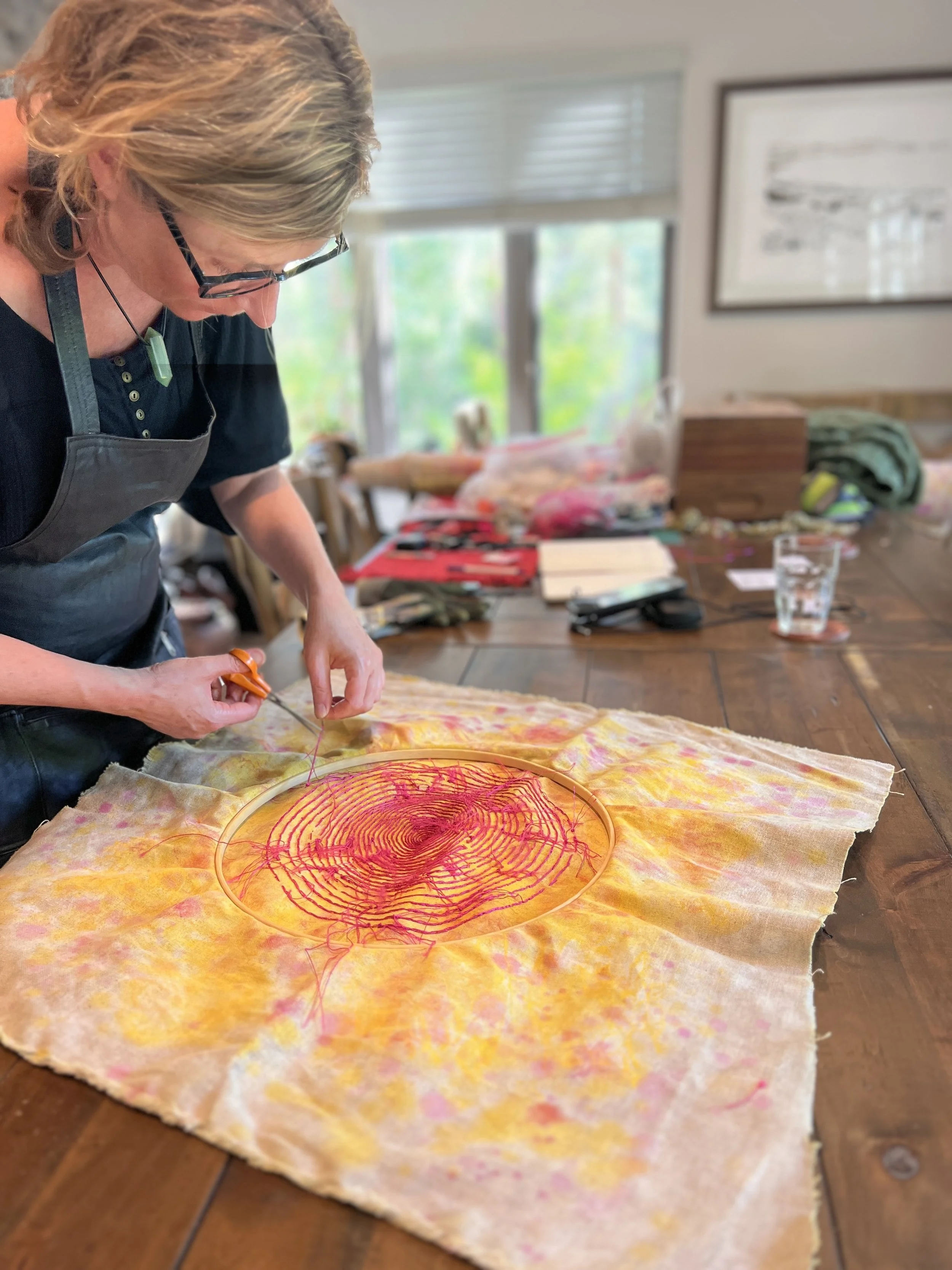 Stitch by stitch, the spiral grows outward from a central origin, echoing the cyclical nature of life and the quiet energy spirals produce. Like the rings in a tree trunk, each line of stitching maps time, emotion, and experience—capturing heartbreaks, joys, injuries, revisited again and again as the stitch line returns on itself while persistently moving forward. The humanness of each sometimes-wonky stitch is intentionally left, a mark of presence and vulnerability. They are records of lived time.