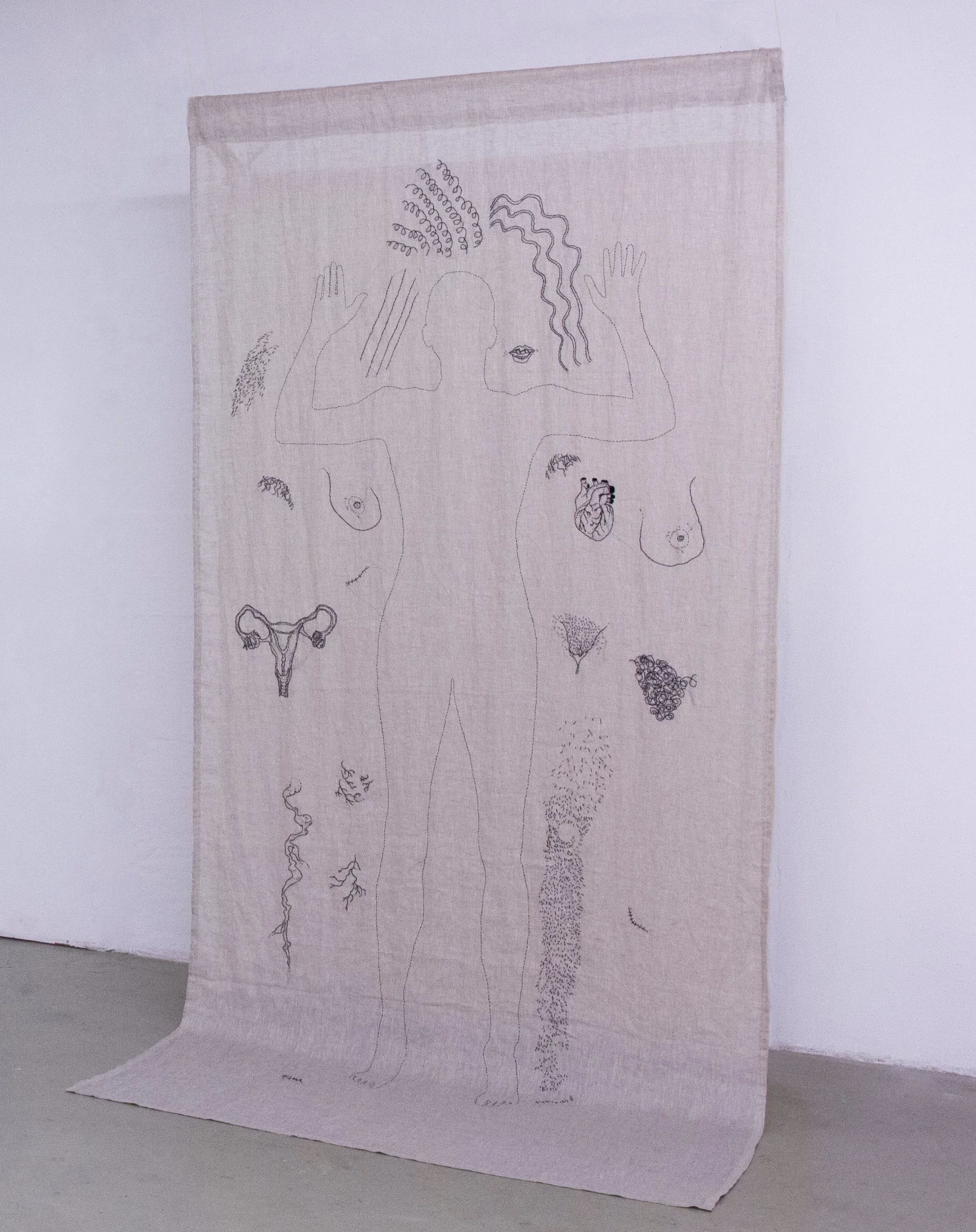 The work takes the female body as a site structured by these conditions. A stitched figure, built slowly through repeated gestures of thread, forms the central body. Yet it is incomplete. The parts of the body that are commonly censored across social, cultural, and digital contexts are not erased but displaced, suspended outside the figure. Their absence is therefore not neutral; it is visible, structural, and active. The body that remains is one that has been edited in advance, shaped by the limits of what can be shown.